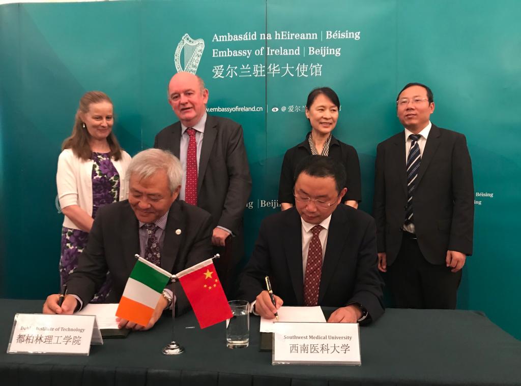 日前,校长何延政代表学校与爱尔兰都柏林理工学院校长助理吴兵教授在爱尔兰驻中国大使馆签署两校合作备忘录。爱尔兰驻华使领馆大使Eoin O'Leary、中国教育国际交流协会副秘书长周燕出席了签署仪式。