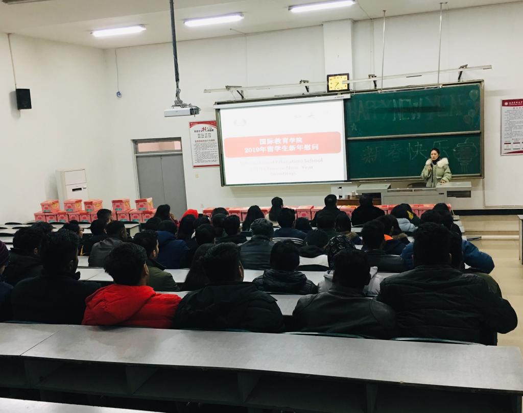 2019年1月21日上午,国际教育学院2019年留学生新年慰问座谈会在荟文楼105举行,这是国际教育学院一院一品项目“文化行天下——中外学生共感中华传统美德”系列活动之一。国际教育学院党总支书记李昌平、院长田耘、党总支副书记肖洁、副院长傅静、全体留学生辅导员以及寒假留校留学生们出席了本次座谈会。