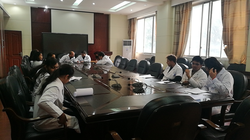 在专家入校见面会上,副校长张春祥对学校整体情况作了简要介绍,史宏灿教授对本次调研情况作了背景介绍,外国语学院院长田耘对我校留学生教育教学情况作了全面汇报。见面会后,专家组通过座谈会、听课、资料审查、观摩教学查房等对我校留学生实习情况作了资料采集。