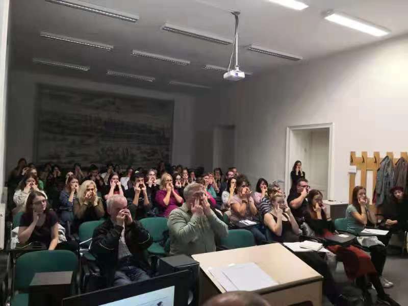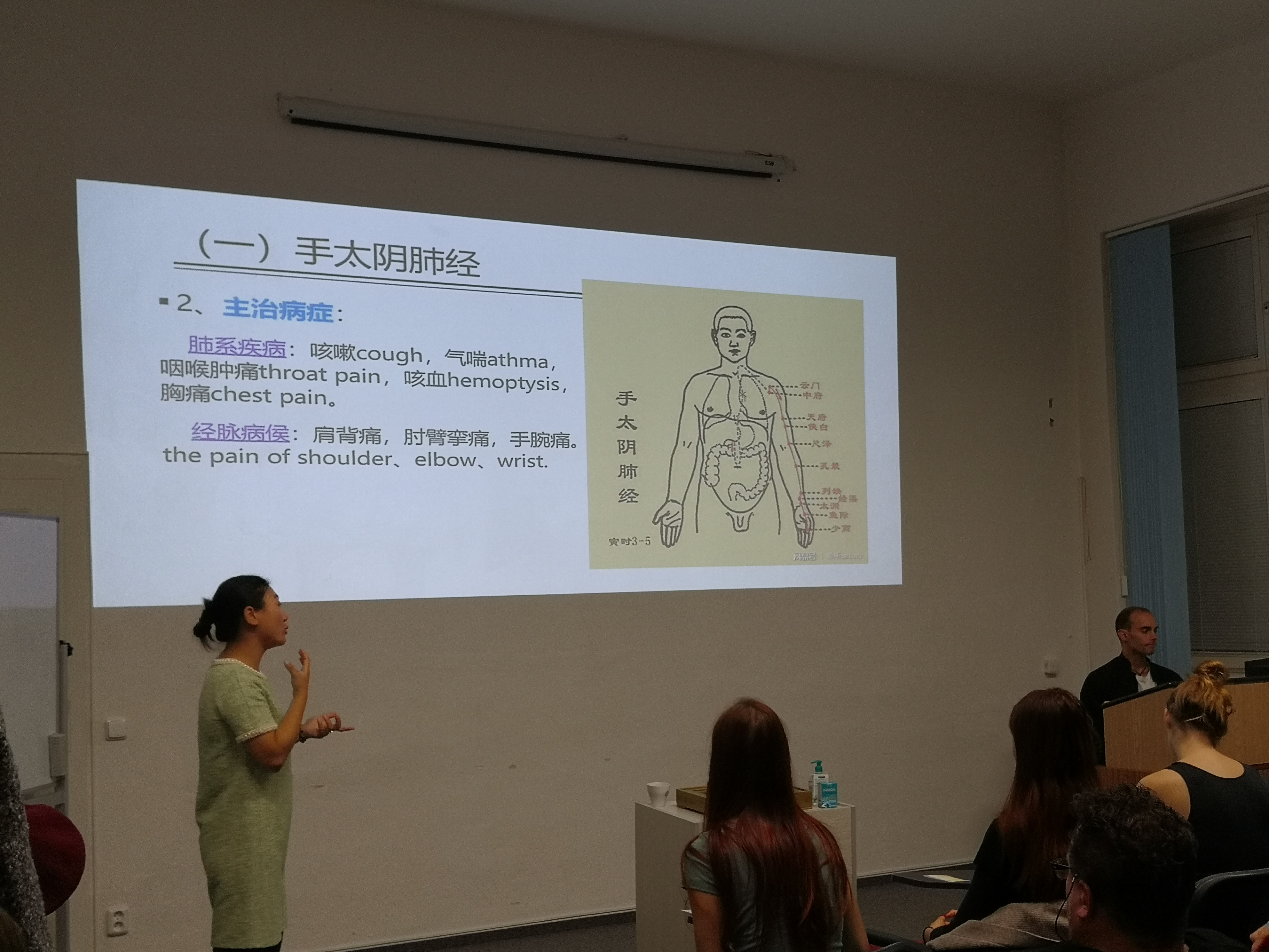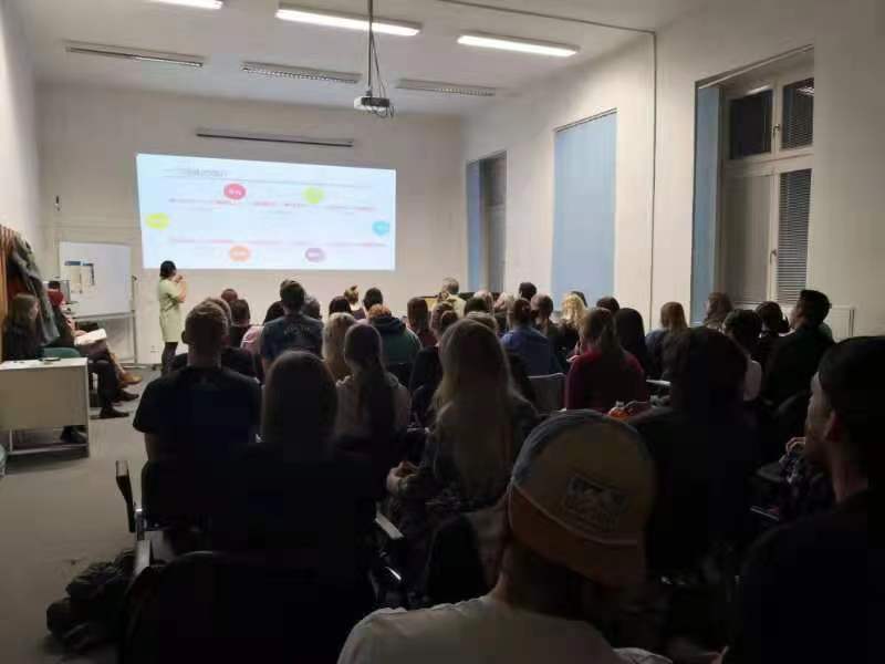 10月4日,中西医结合学院•附属中医医院罗婧医师受邀参加帕拉茨基大学孔子学院组织的冬季中医基础理论系列讲座,为来自捷克奥洛穆茨、布拉格、布尔诺等地的60余位学员讲授经络学总论,主要介绍了针灸学、经脉、络脉,讲解了十二经脉、任脉、督脉的循行及主治,展示了人体的部分穴位及针灸方法。