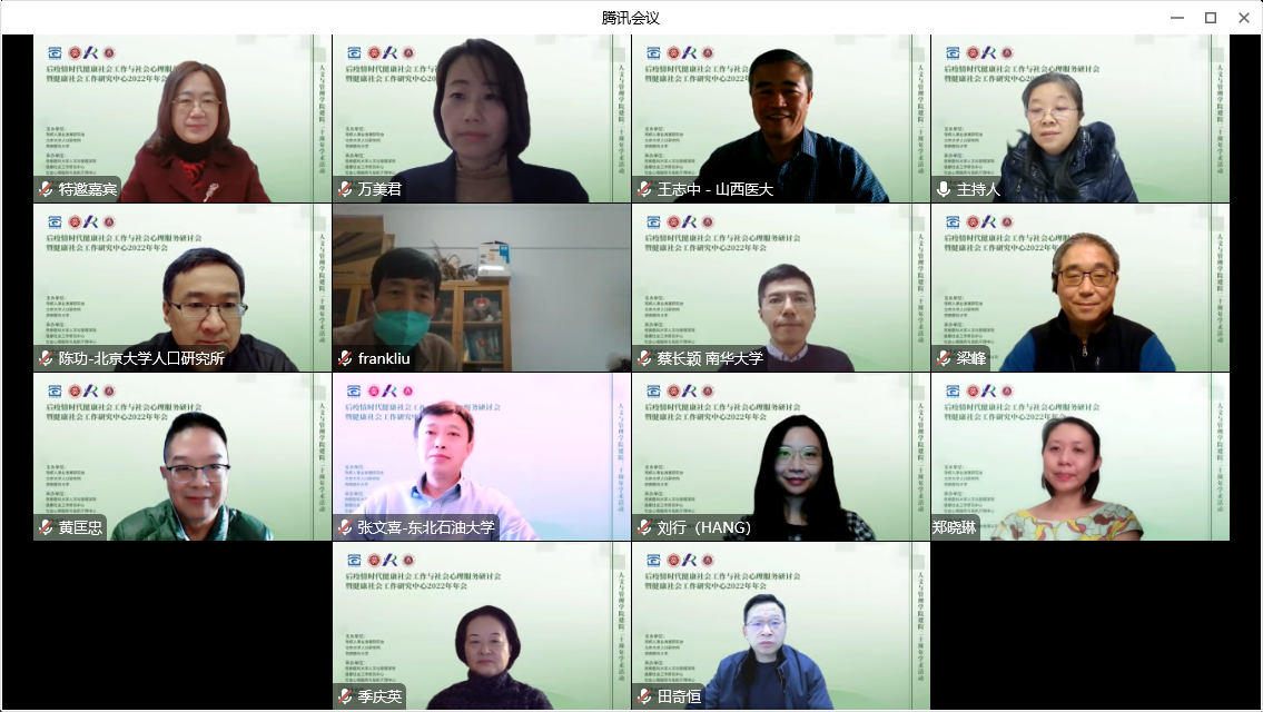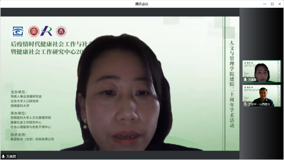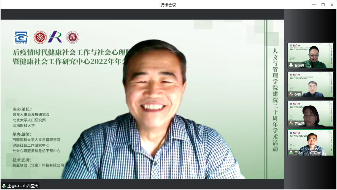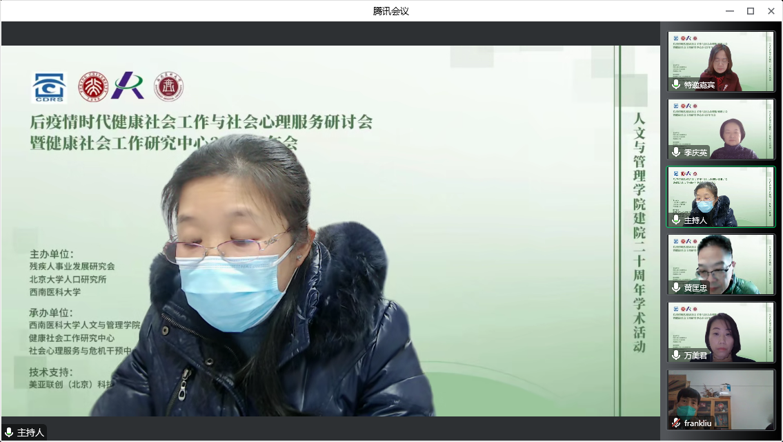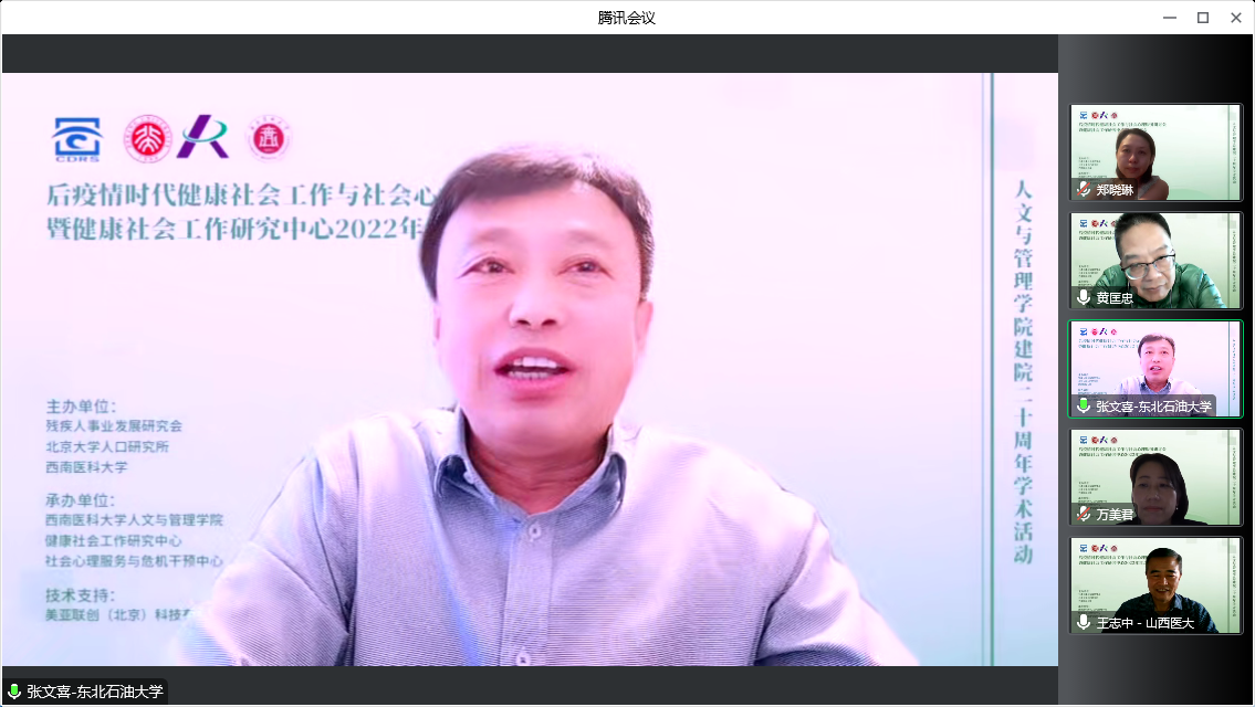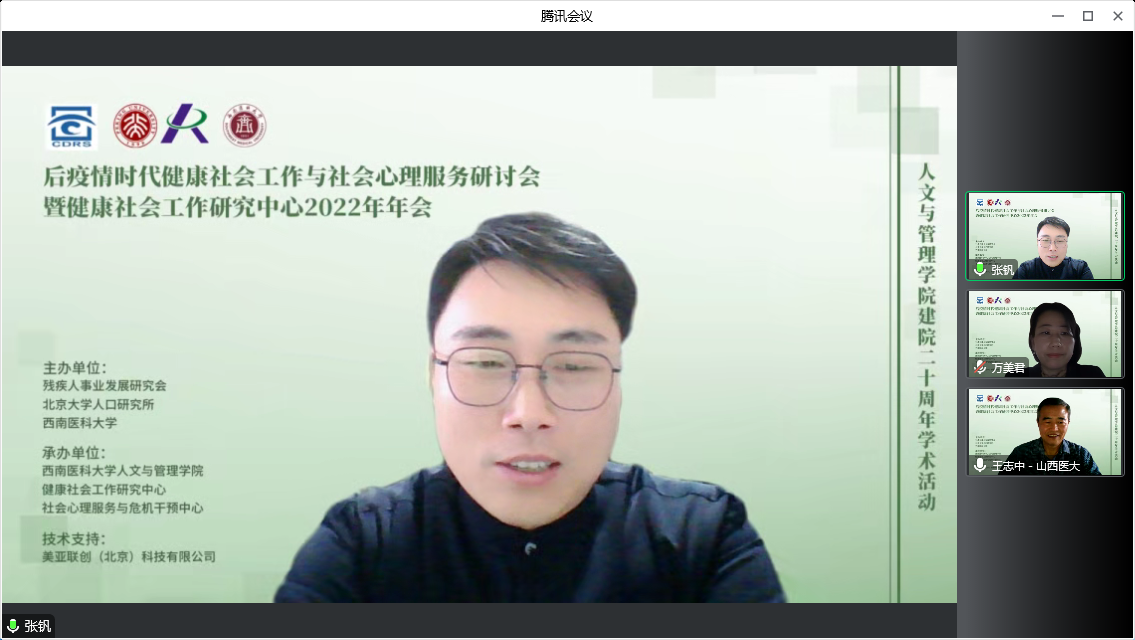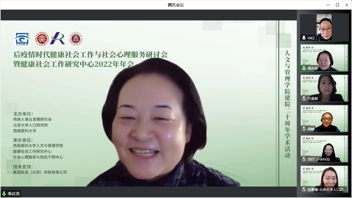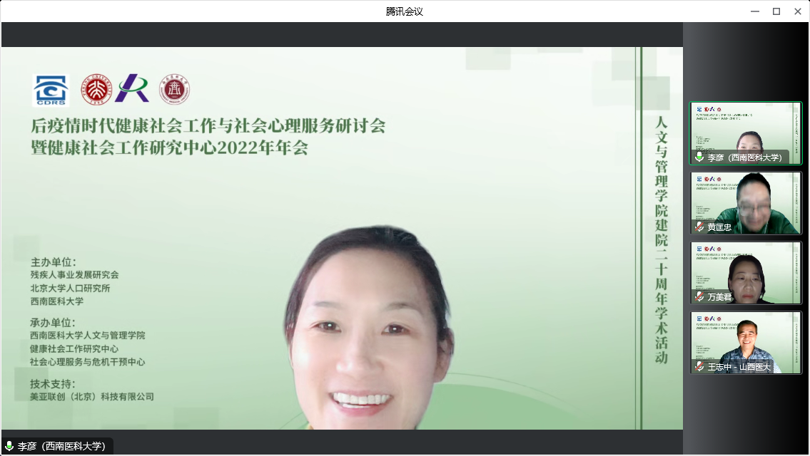 12月17日,人文与管理学院建院二十周年学术活动之“后疫情时代健康社会工作与社会心理服务”研讨会暨2022年健康社会工作研究中心年会通过美亚平台在线举行。会议由残疾人事业发展研究会、北京大学人口研究所、beats365唯一官网入口官网主办,beats365唯一官网入口官网人文与管理学院、泸州市健康社会工作研究中心、社会心理服务与危机干预研究中心承办。来自社会工作领域知名专家以及高校、民政系统、社会组织、医疗系统等领域的近500人报名参加此次线上会议,观看次数累计达2500多人次。