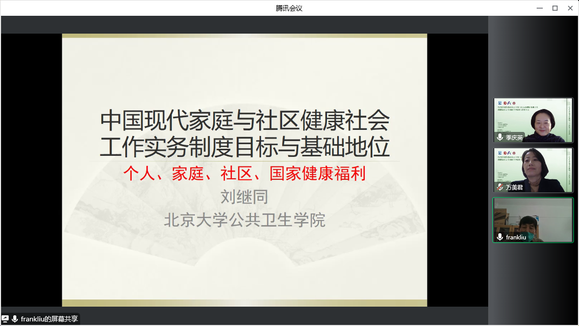 会议第一阶段为“健康社会工作实务国际对话”主旨发言,由上海交通大学医学院附属上海儿童医学中心党委书记季庆英教授主持。美国学者Frank Liang、Hang Liu、北京大学刘继同教授、中国台湾地区学者蔡长颖助理教授先后进行了发言。四位专家分别从社工在政府主导的社会服务设置中的角色、医养结合体系、中国现代家庭与社区健康社会工作以及后疫情时代医务社工的实践等方向进行主旨发言。专家们重点研讨了不同国家、不同地区差异背景下社会工作的不同定位及相同使命,进一步跨越了认知鸿沟,增进了交流共识,彰显出社会工作的各个环节务必因地制宜、因时制宜。北京大学张雅璐助理教授、重庆城市管理职业学院智慧康养学院院长田奇恒教授分别进行了详细的点评。季庆英教授对第一阶段的发言进行总结,并对上海医务社会工作进行了详细、深入的介绍。